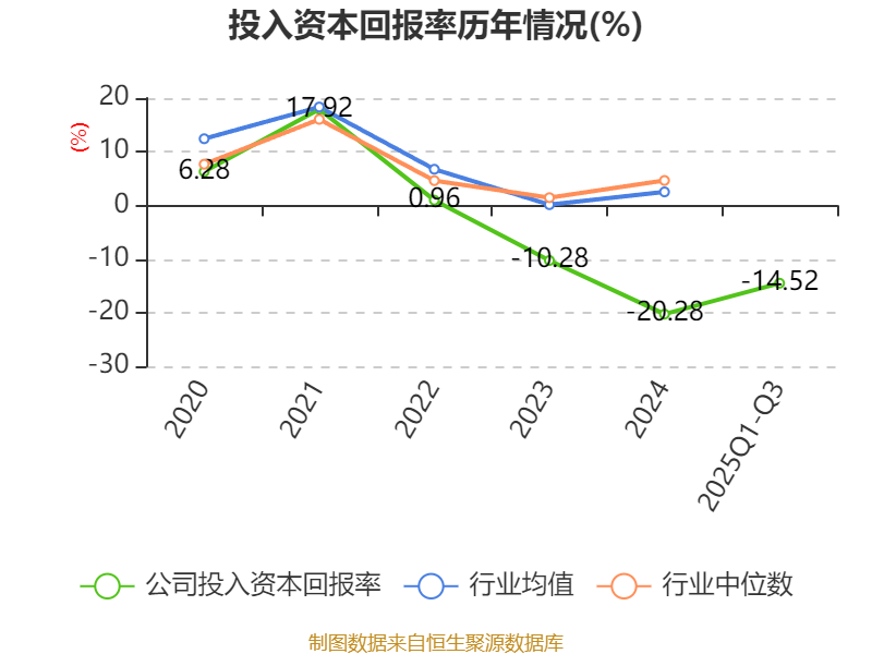盈利能力方面, 2025年前三季度公司加权平均净资产收益率为-14.34%,同比下降4.2个百分点。公司2025年前三季度投入资本回报率为-14.52%,较上年同期下降2.71个百分点。