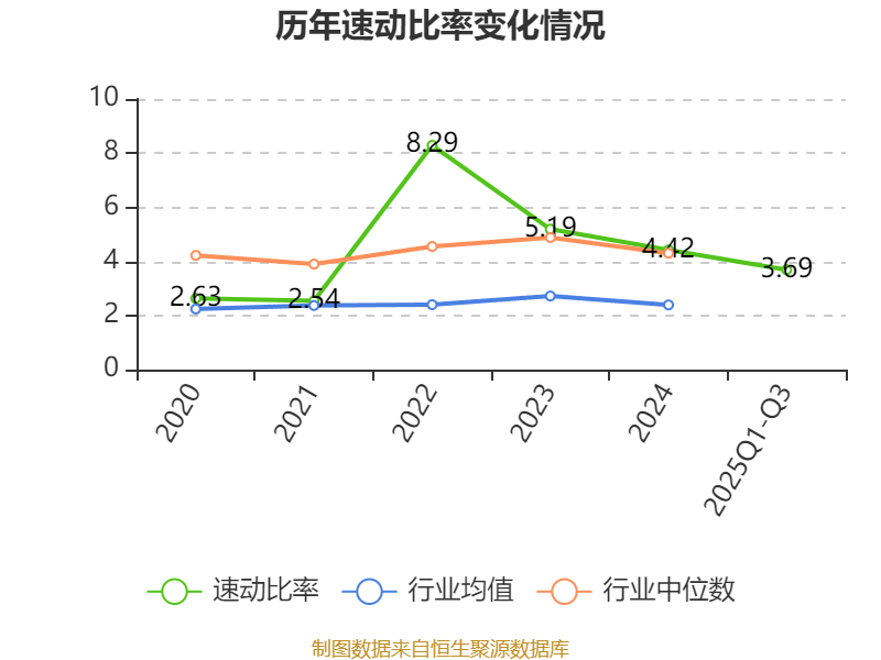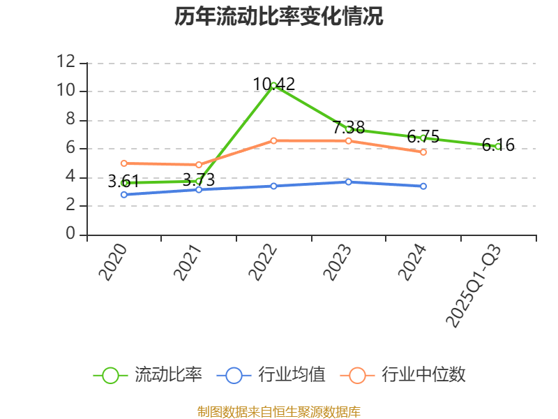 2025年前三季度,公司流动比率为6.16,速动比率为3.69。