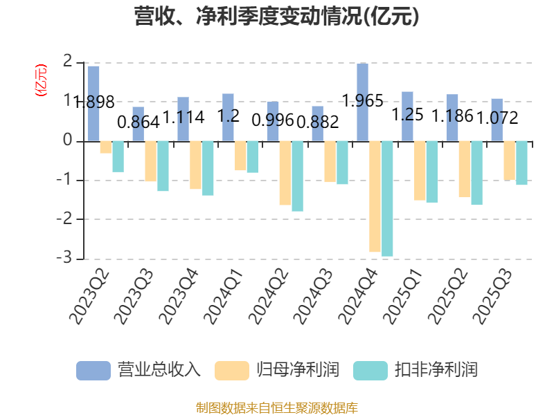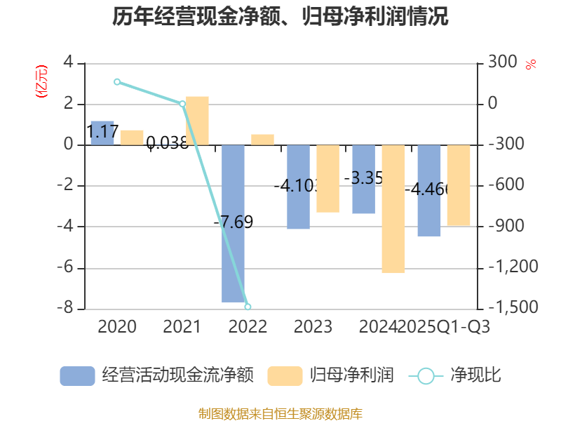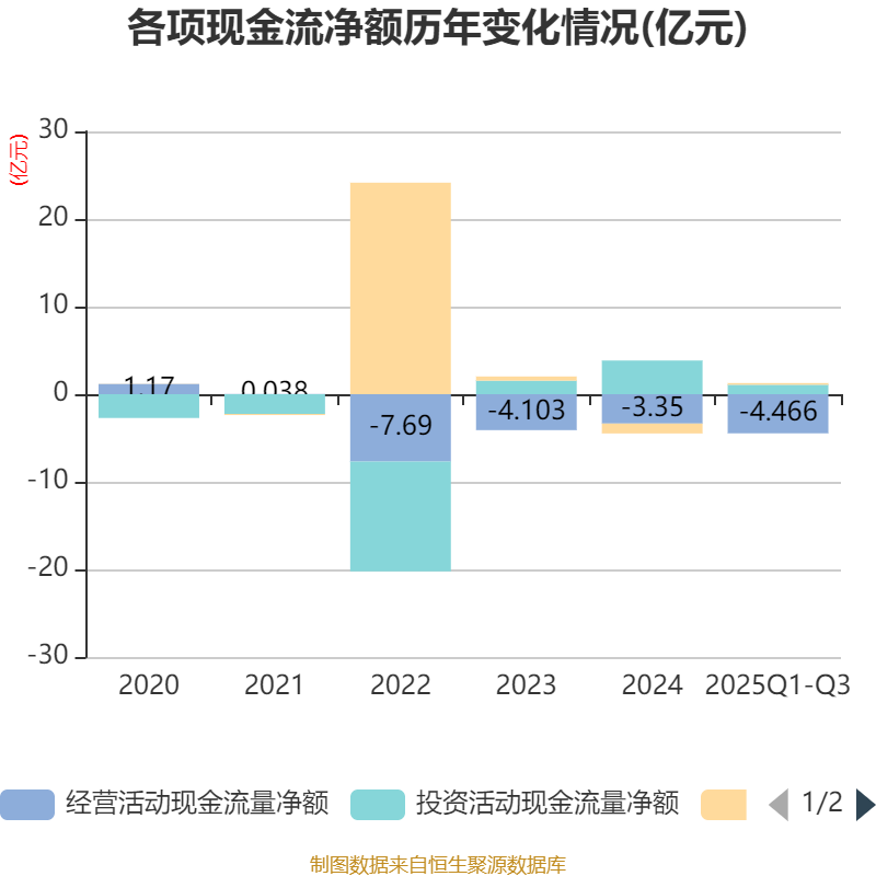 2025年前三季度,公司经营活动现金流净额为-4.47亿元,同比减少1.8亿元;筹资活动现金流净额1902.69万元,同比增加1.29亿元;投资活动现金流净额1.08亿元,上年同期为7692.73万元。