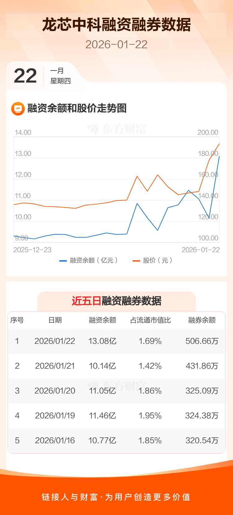 交易所最新数据显示,龙芯中科于2026年1月22日获融资买入8.77亿元,融资偿还5.67亿元,当日融资净买入3.09亿元。目前,该股融资余额13.08亿,占流通市值比例为1.69%。