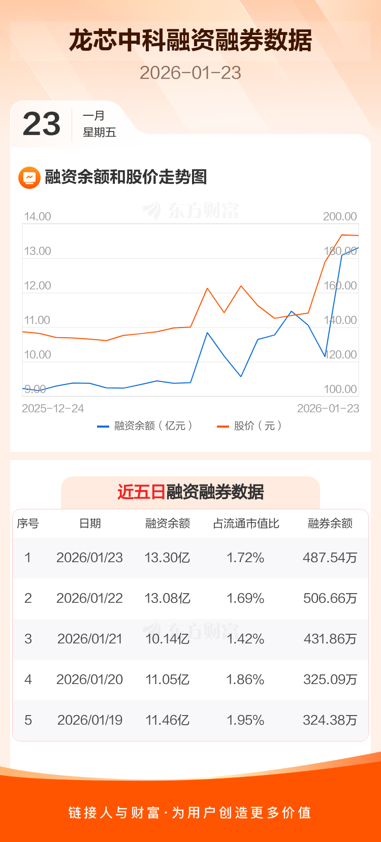 交易所最新数据显示,龙芯中科于2026年1月23日获融资买入4.55亿元,融资偿还4.33亿元,当日融资净买入2272.03万元。目前,该股融资余额13.30亿,占流通市值比例为1.72%。
