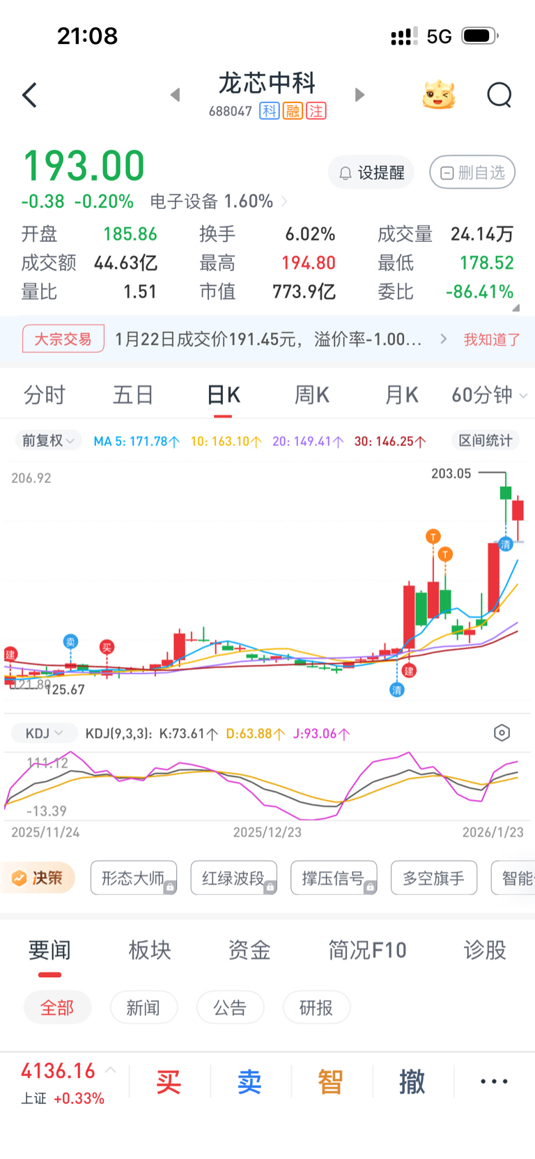 龙芯中科,守了3个多月,开花结果,小有收获,191元卖出,可惜周五没有果断接回,那就再看看是否有好的机会接回。