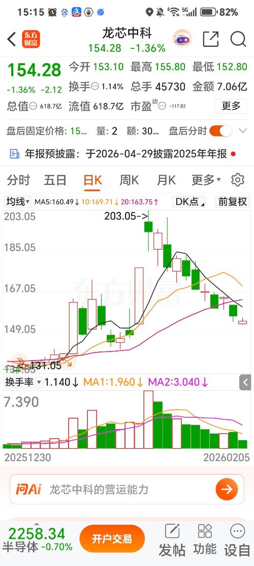 2月5日,龙芯中科极致缩量,换手率仅1.14%,跌1.36%。盘中最低点152.8元,击穿1月21日涨停那天的最低价(153.04元)。天天像蚂蝗一样,陪朱莉耗着。有种明天继续往下打,去碰一下起涨点148.20元。