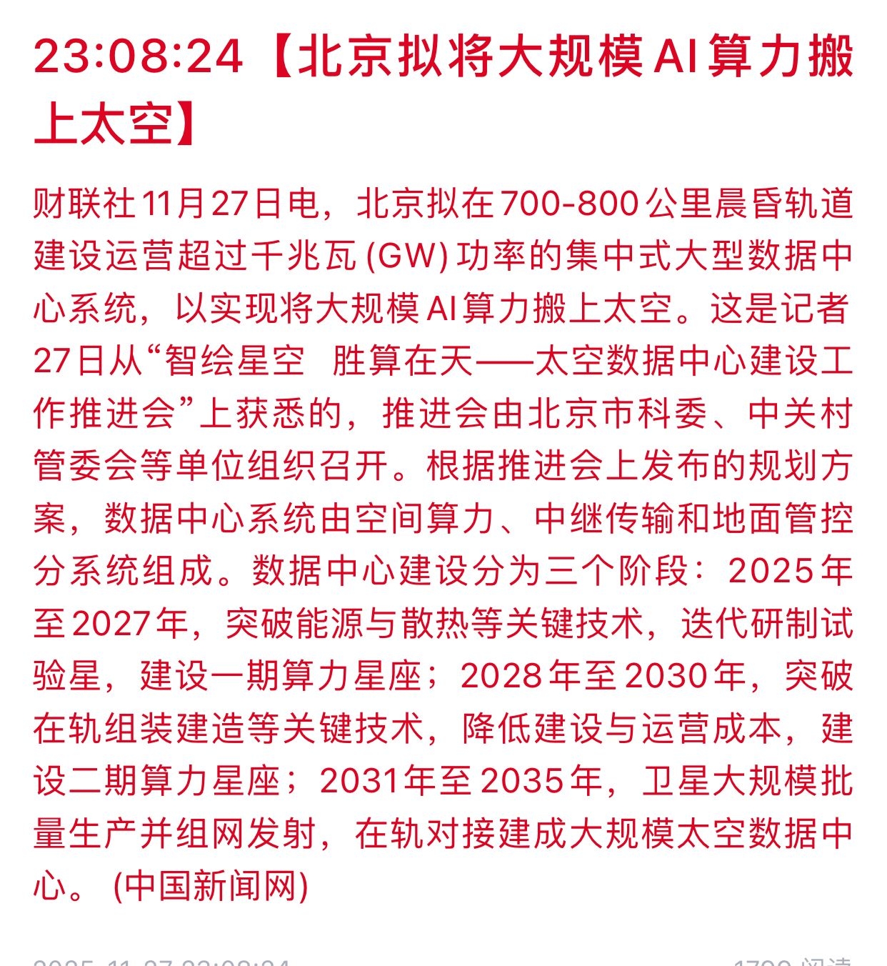 11月27日,“北京拟在700 - 800公里晨昏轨道建设千兆瓦级太空数据中心”的重磅消息引爆科技圈。这一规划剑指AI算力“上天”,计划分三阶段打造集中式大型数据中心系统:2025 - 2027年突破能源与散热技术、建设试验星及一期算力星座;2028 - 2030年攻关在轨组装、降本提效;2031 - 2035年批量组网建成大规模太空数据中心。