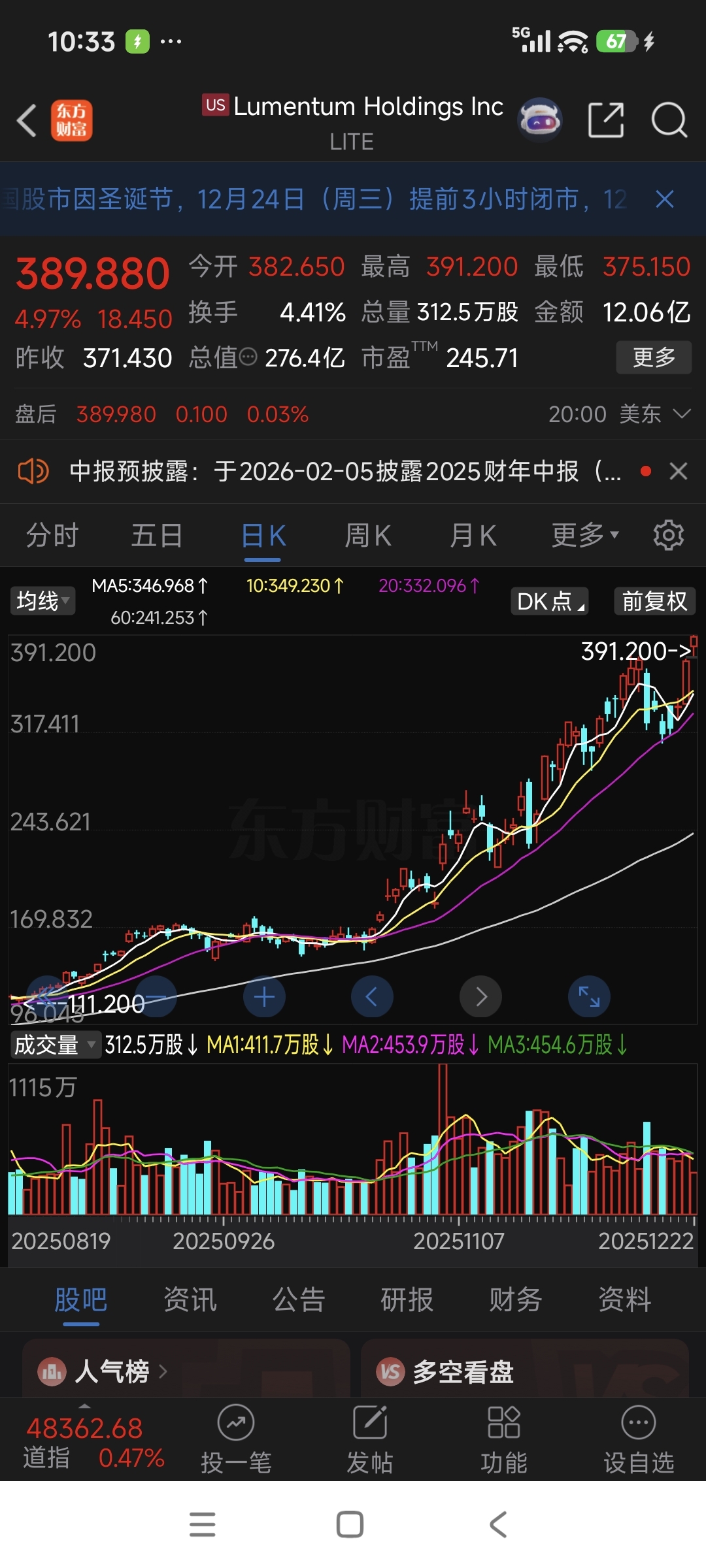 昨晚美股光芯片龙头Lumentum再创新高,一早想着今天如果有机会要继续加仓,早