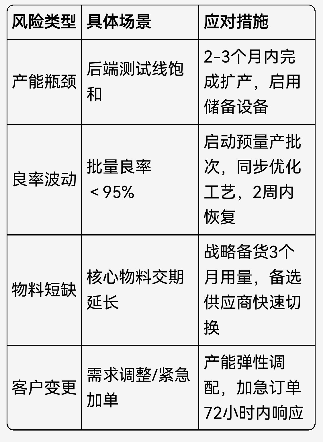 产能预留:锁定月产能5-8万颗,后端测试线优先排产,扩产周期2-3个月(可扩1-3倍)