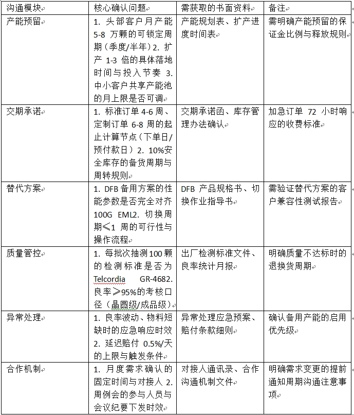 替代方案:同平台DFB备用,切换周期≤1周,性能指标对齐