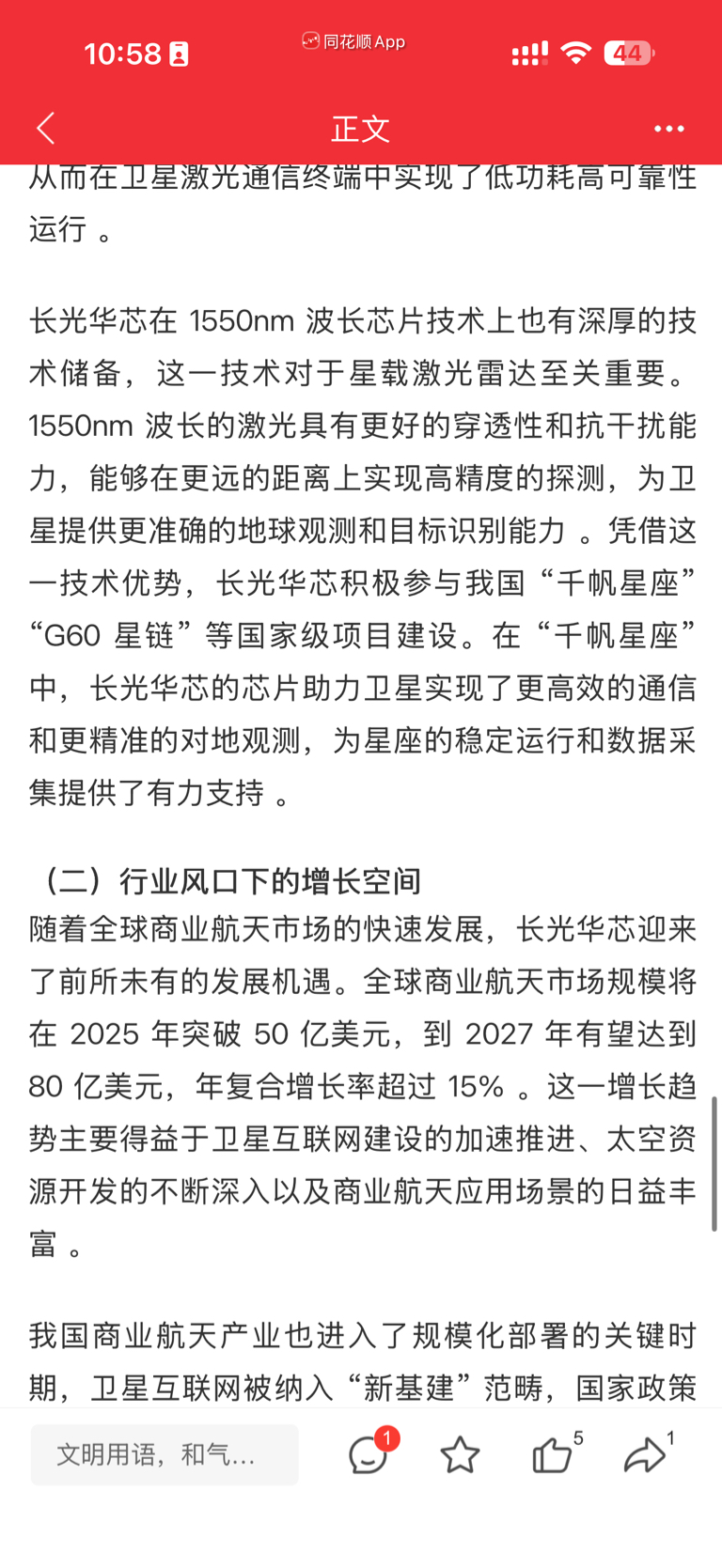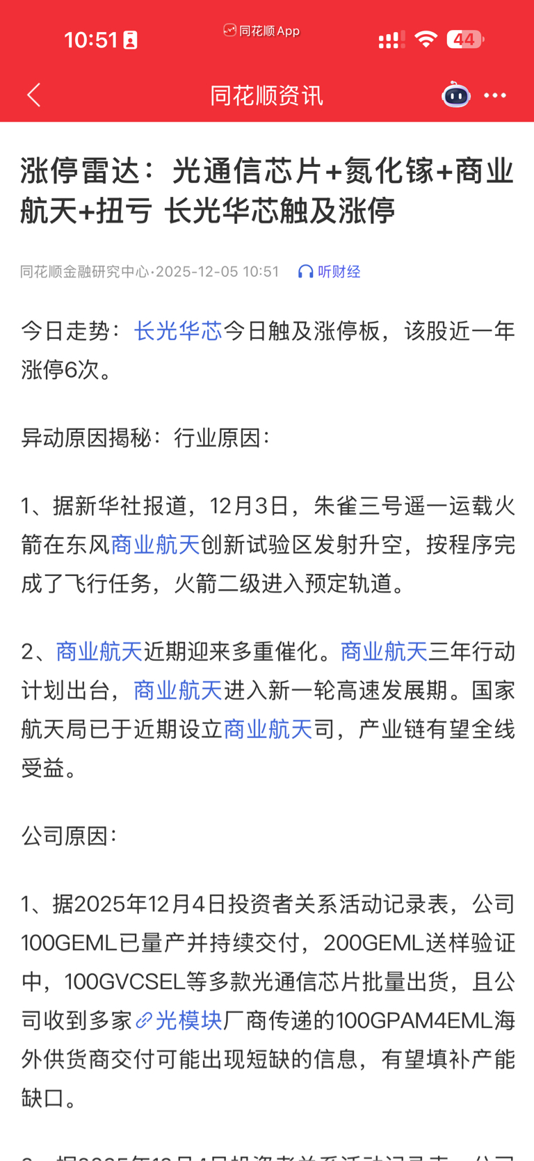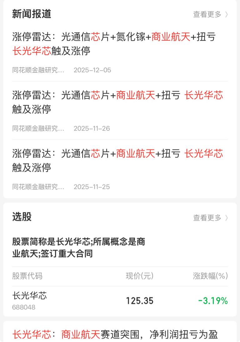 $长光华芯(SH688048)$ 这么核心且在商业航天有夯实业绩、订单、深度参与合作的公司,短期的下跌我不在意了,还会起飞的,11月下旬它就代表商业航天板块领头上涨,我相信调整一个月后,1月资金开始注重业绩时候,商航业绩和基本面差的公司,只涨情绪面的公司开始淘汰时,才是我们又一次带头的机会。亏着呢,也下不了车。看好公司26年光通信芯片的前景、商航的空间、年报的持续增长。