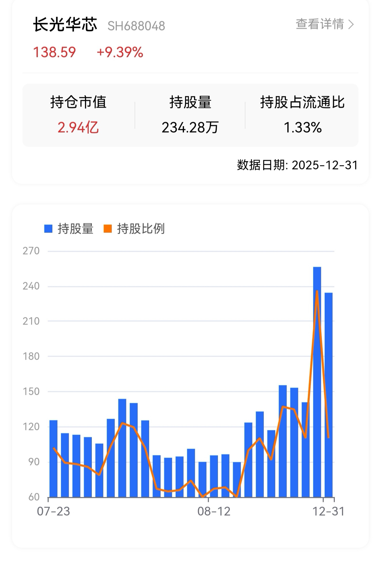 $长光华芯(SH688048)$ 北向资金Q4持仓已经公布,北向继续加仓媛姐,走势稳健,媛姐一手十几万,主要是机构在推动,长光略减,但依然在高位,长光的概念多,但涨跌不是散户说了算,看戏就好,长线无忧。