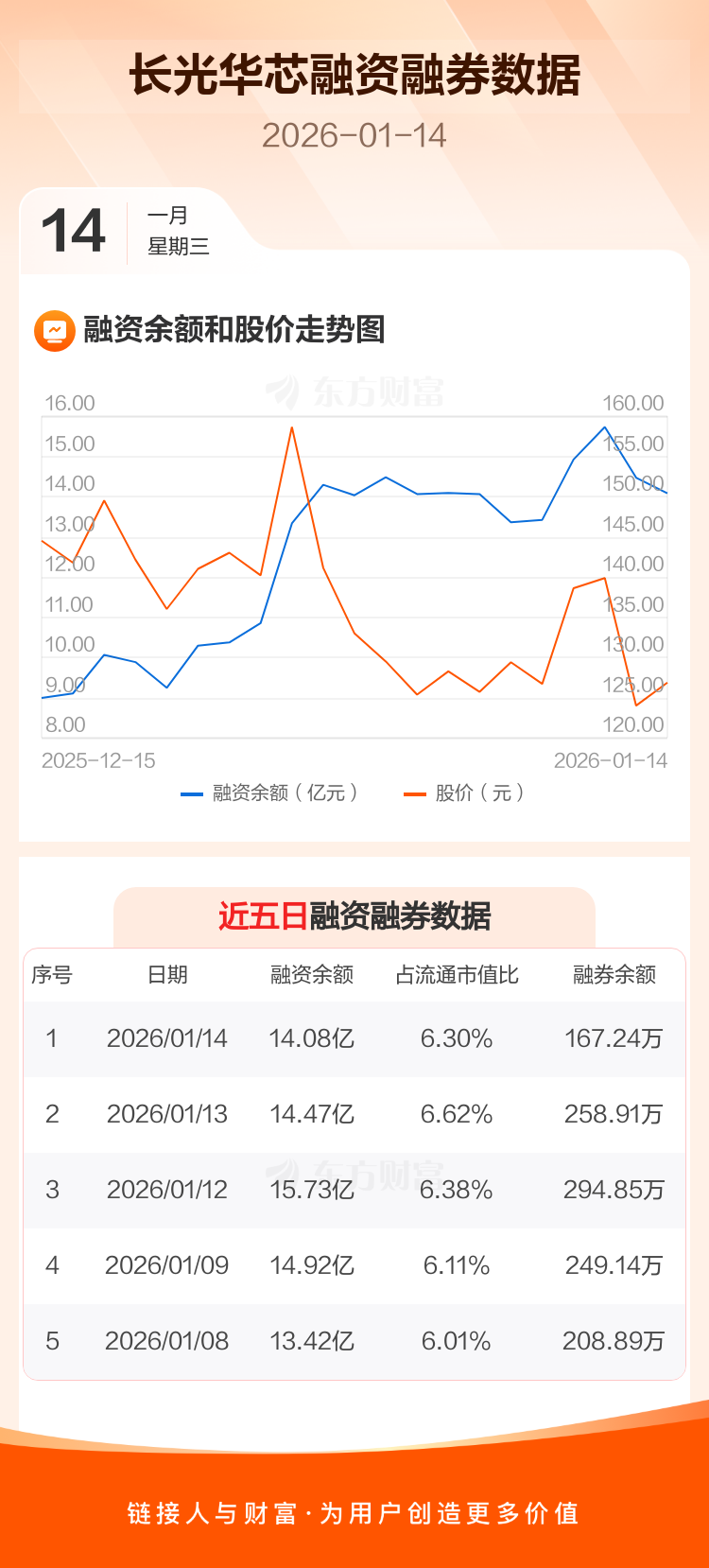 交易所最新数据显示,长光华芯于2026年1月14日获融资买入2.36亿元,融资偿还2.76亿元,当日融资净偿还3921.39万元。目前,该股融资余额14.08亿,占流通市值比例为6.30%。