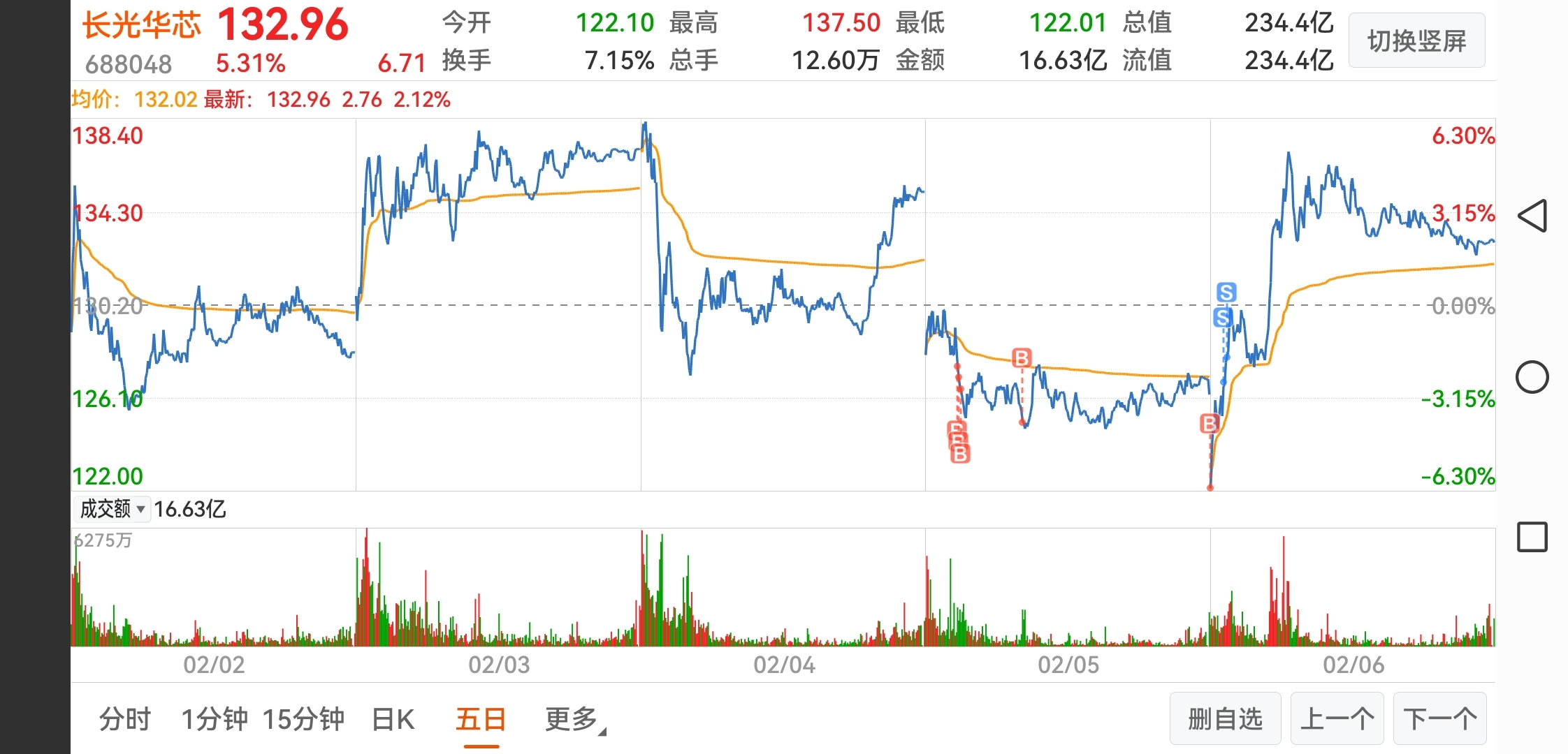 $长光华芯(SH688048)$ 卖飞了,早上开盘进做对了。昨天我3000多股,今天127出的,最高涨到137,挺可惜3万。