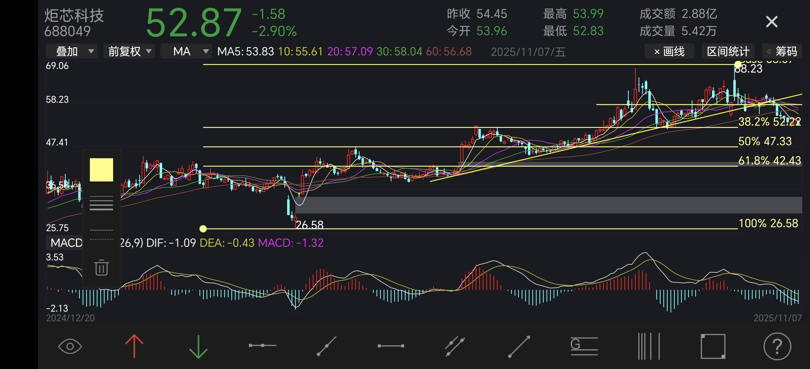 $炬芯科技(SH688049)$ 黄金分割点+颈线附近,破了短期不要奢望!这个点破了该割就割!历史上跌破了基本起不来了,以后反弹的重要强压力位