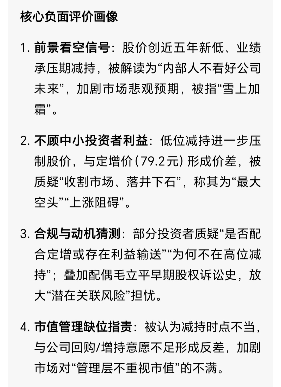 $爱博医疗(SH688050)$ 白莹在爱博医疗股价低位减持(2024-2025年两轮,累计约2.5%)的市场负面评价,集中在信心打击、时机争议、合规疑虑、利益冲突联想四方面。