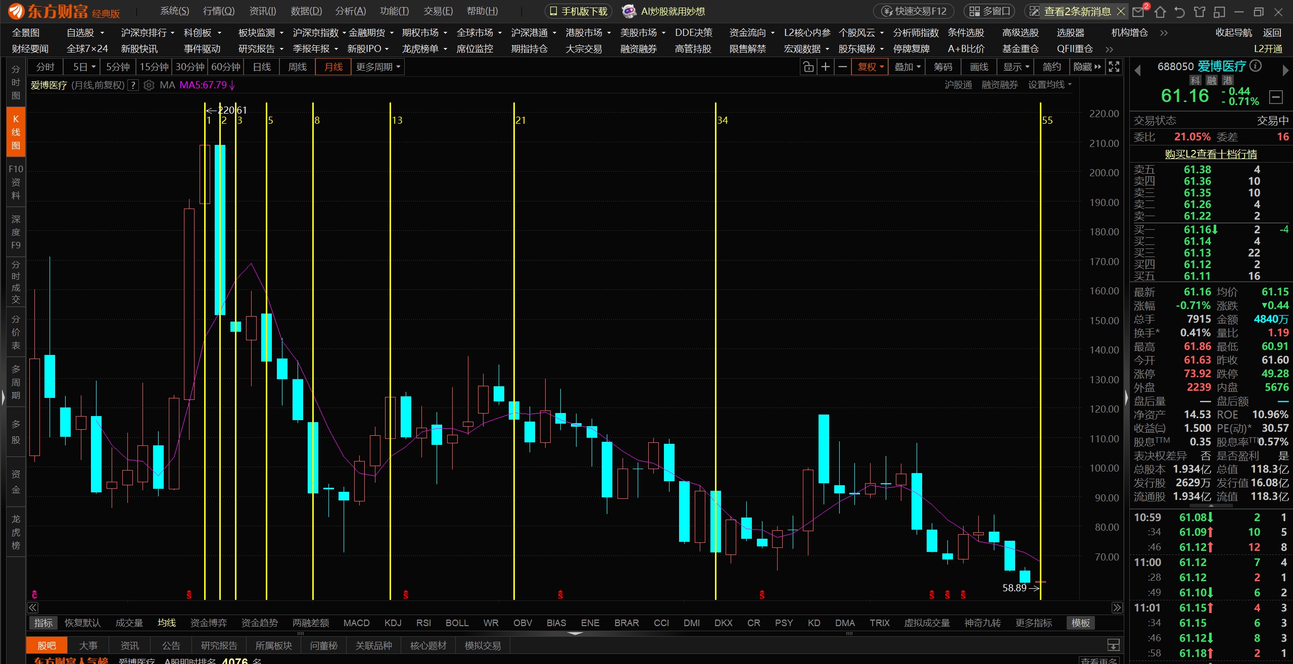 今天收盘是爱博从历史高位下跌的第55个月,斐波那契数列中的重要转折点,2026年