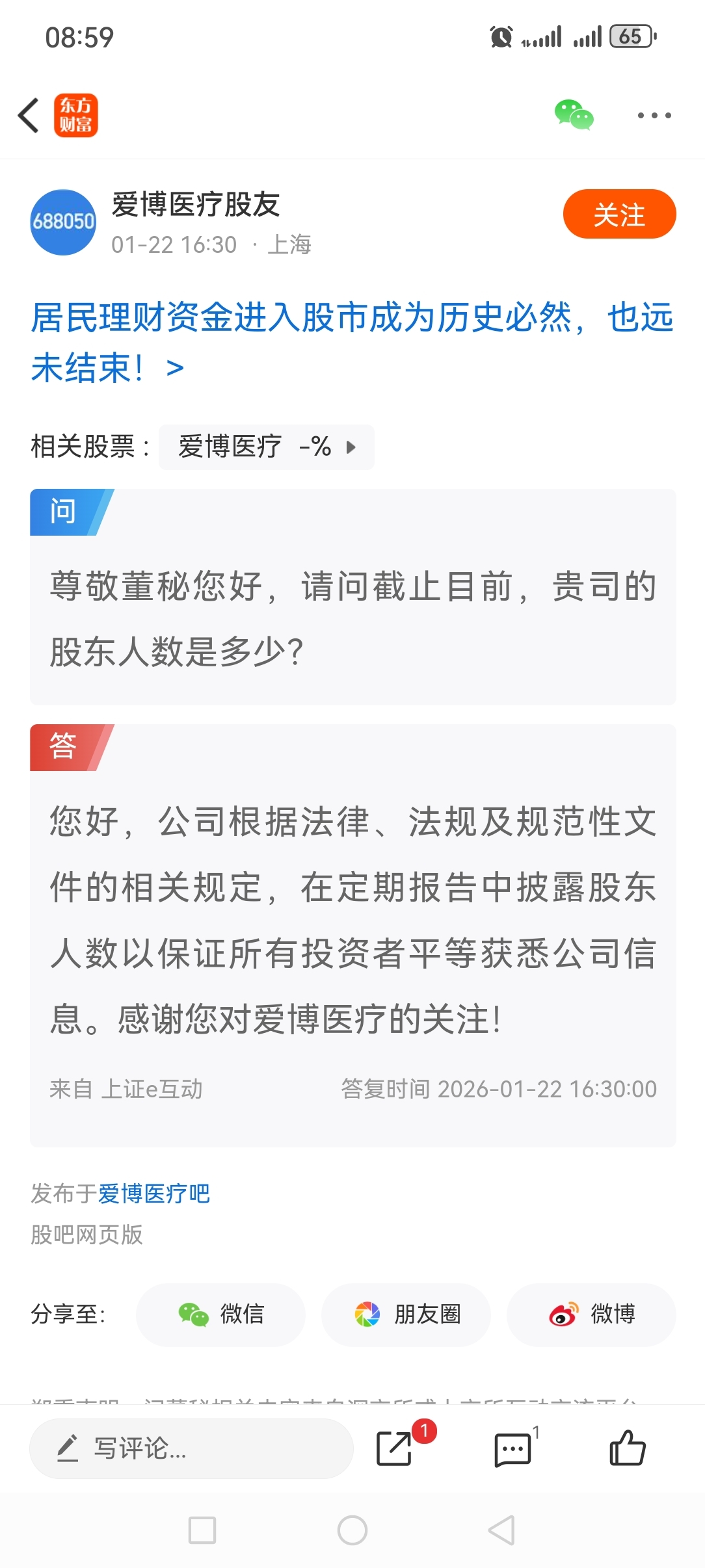 $爱博医疗(SH688050)$ 保证投资者公平的唯一办法就是公布每旬的股东人数,投资者公开提问他们也不公布,但是他们会私下告诉个别关系特别的人,这就是黑幕!