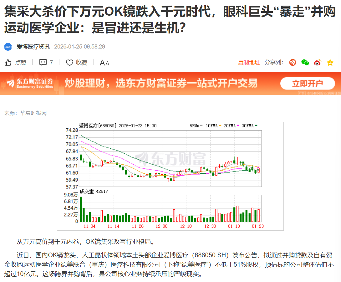 1、今天东财网发了一篇爱博资讯,《集采大杀价下万元OK镜跌入千元时代,眼科巨头“暴走”并购运动医学企业:是冒进还是生机?》的文章。我看了后不得不说,主力你们太狠了。这篇文章的作者是于娜,文章最早发表于华夏时报网,东方财富网进行了转载,于娜是《华夏时报》记者,