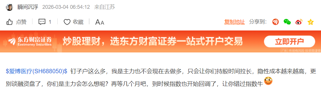 温馨提示: 1.根据《证券法》规定,禁止编造、传播虚假信息或者误导性信息,扰乱证券市场;2.用户在本社区发表的所有资料、言论等仅代表个人观点,与本网站立场无关,不对您构成任何投资建议。用户应基于自己的独立判断,自行决定证券投资并承担相应风险。《东方财富社区管理规定》