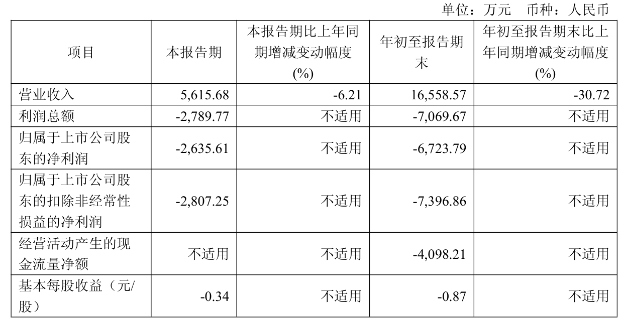 其中,第三季度,公司营业收入为5615.68万元,同比下降6.21%;归母净利润-2635.61万元,同比下降1316.09%;扣非净利润-2807.25万元,同比下降307.16%。
