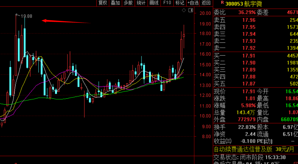 航宇微:商业航天板块的标,航宇微昨天的走势属于震荡的箱体突破,盘中几次大单连续放量,所以盘中低点及时跟进,博弈今天的溢价,目前的目标是周线前高19.88。看能否突破这个位置。