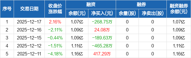 融资方面,当日融资买入450.74万元,融资偿还719.49万元,融资净偿还268.75万元。融券方面,融券卖出0股,融券偿还0股,融券余量0股,融券余额0元。融资融券余额合计1.07亿元。
