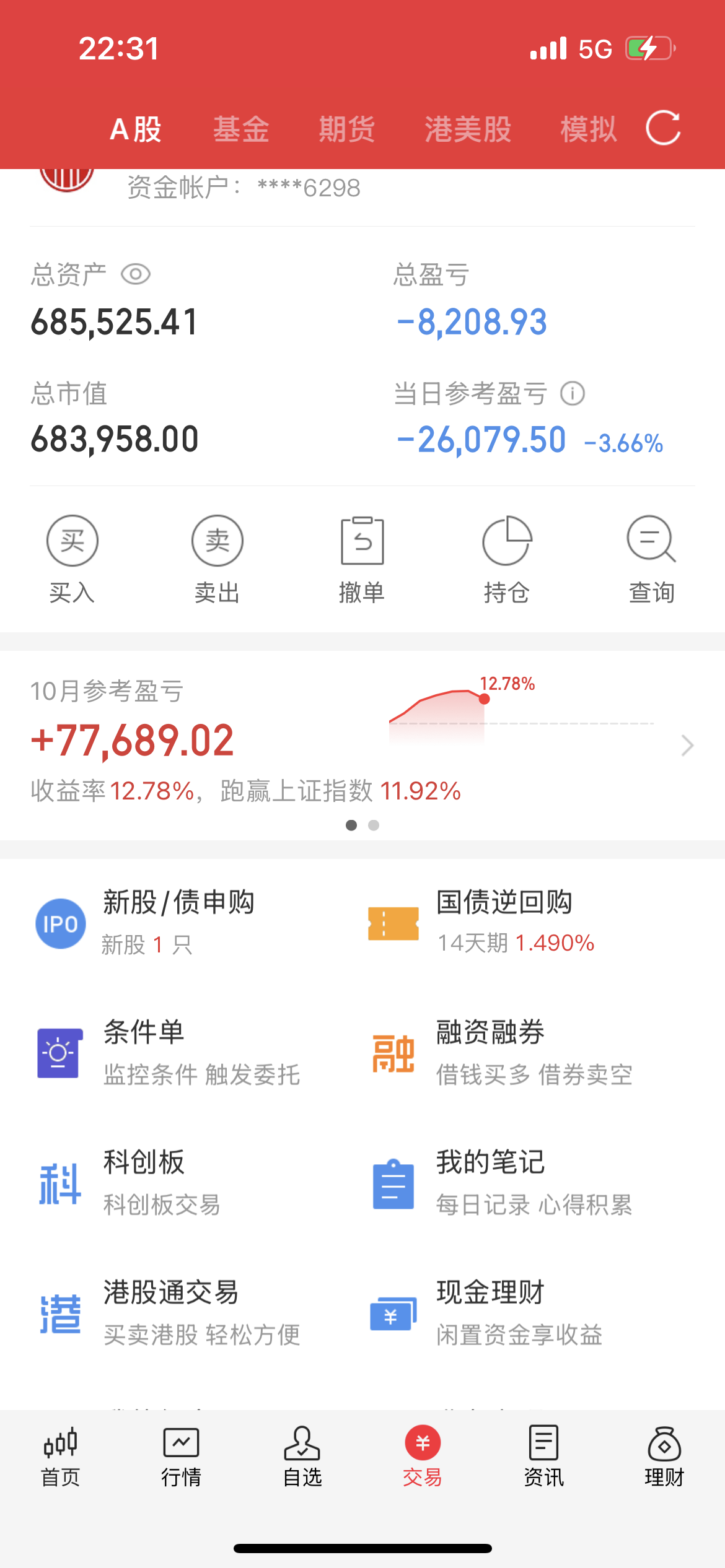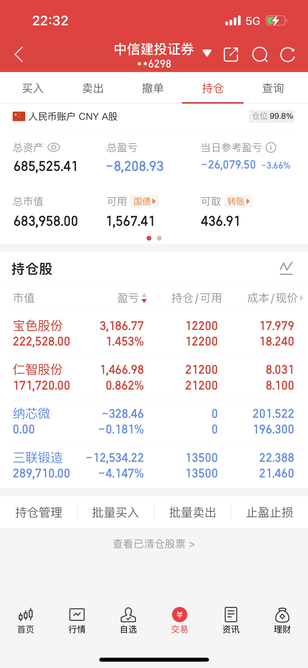 目前净值68.5万,今天较昨日的净值有所回撤,一是行情,二是因为三联锻造的利空,不过个人认为个股及指数的问题都不会太大,平常心对待了,操作上今天放弃了一只纳芯微,仓位补到了三联跟宝色,仁智不变。。。$纳芯微(SH688052)$ $宝色股份(SZ300402)$ $仁智股份(SZ002629)$