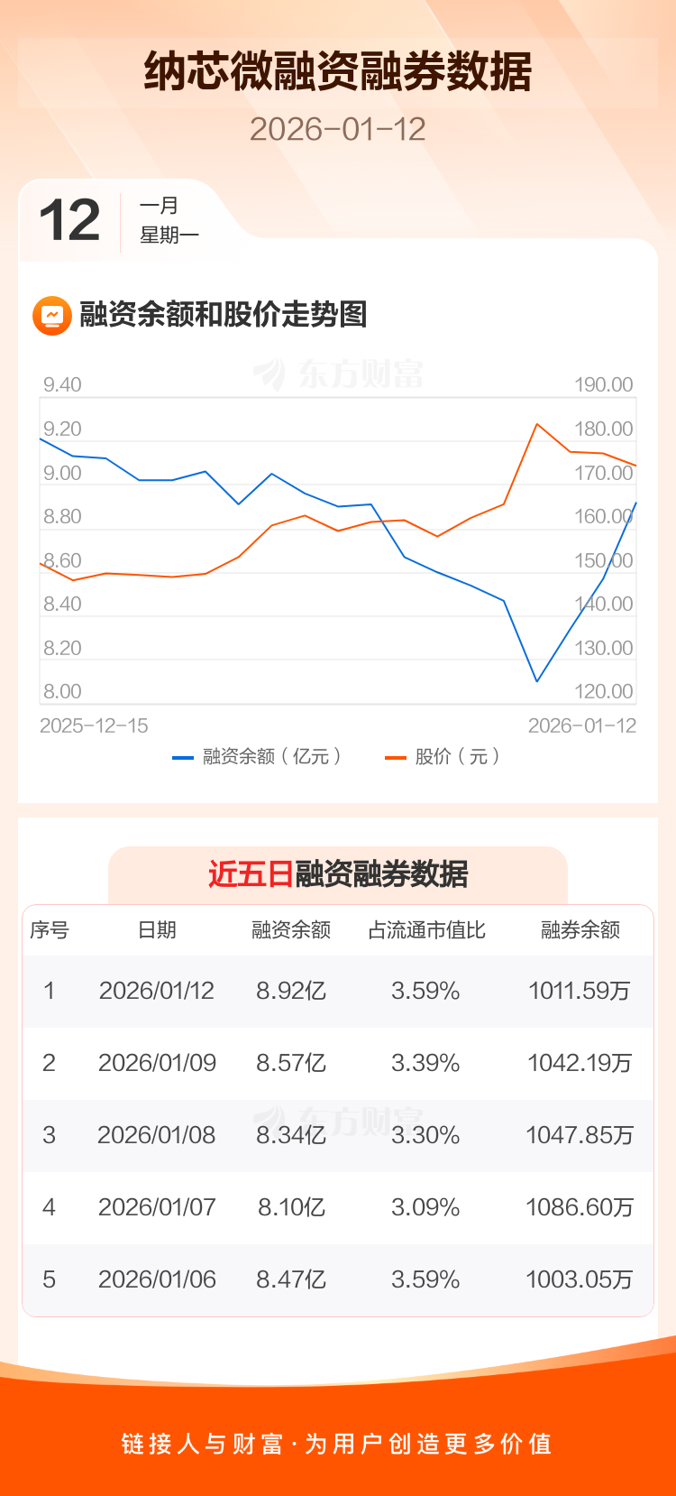 交易所最新数据显示,纳芯微于2026年1月12日获融资买入7702.59万元,融资偿还4188.98万元,当日融资净买入3513.61万元。目前,该股融资余额8.92亿,占流通市值比例为3.59%。