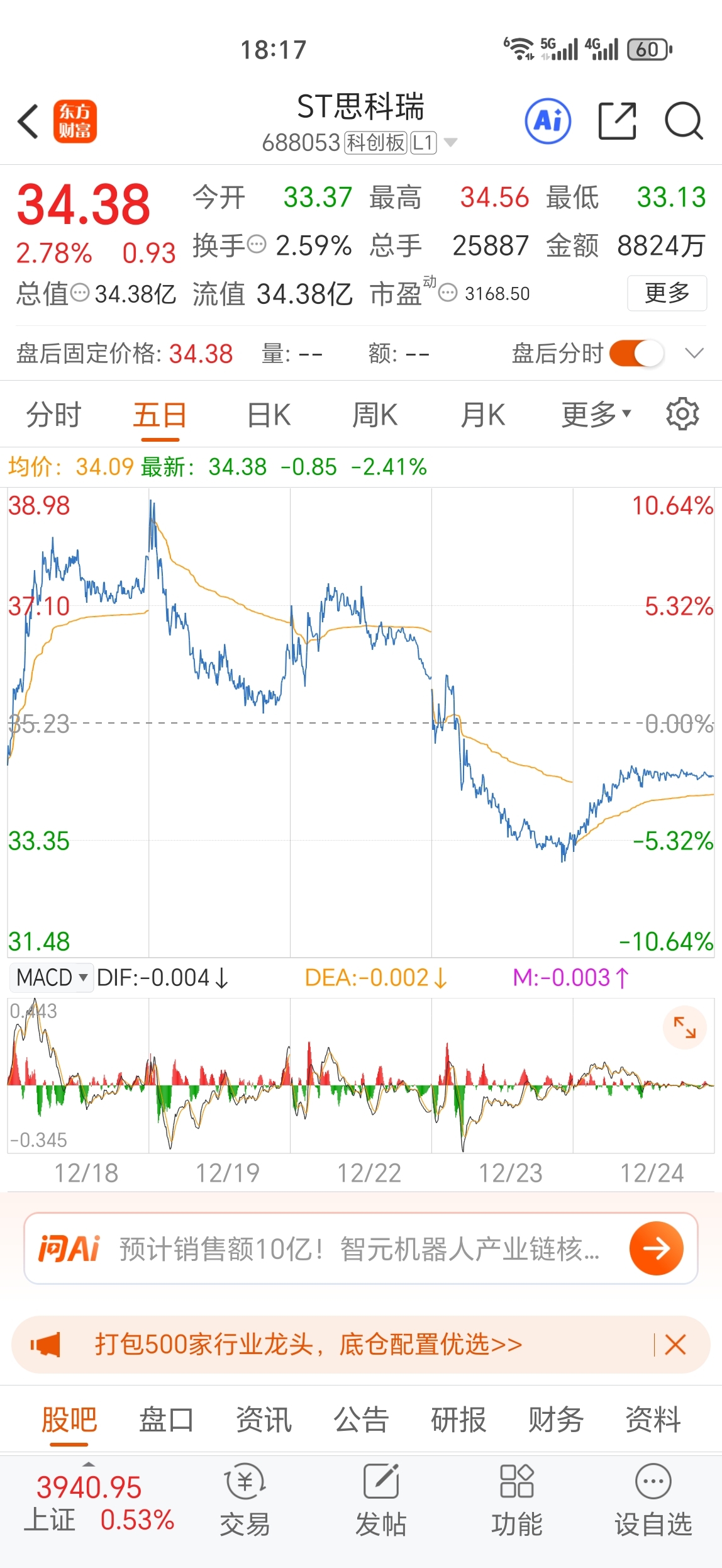 $ST思科瑞(SH688053)$ 够狠的,三天跌了5块多,今天随大盘反弹连收复昨天的失地一半都没有,看起来火候欠佳,毕竟带罪之身(st)不能太张扬。哎,幻想骑上快牛太难了!