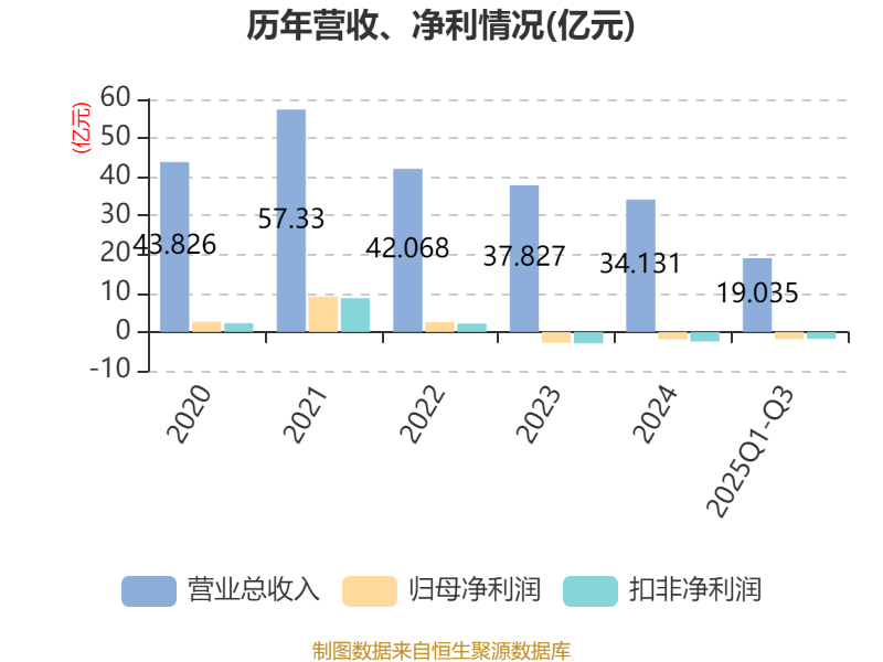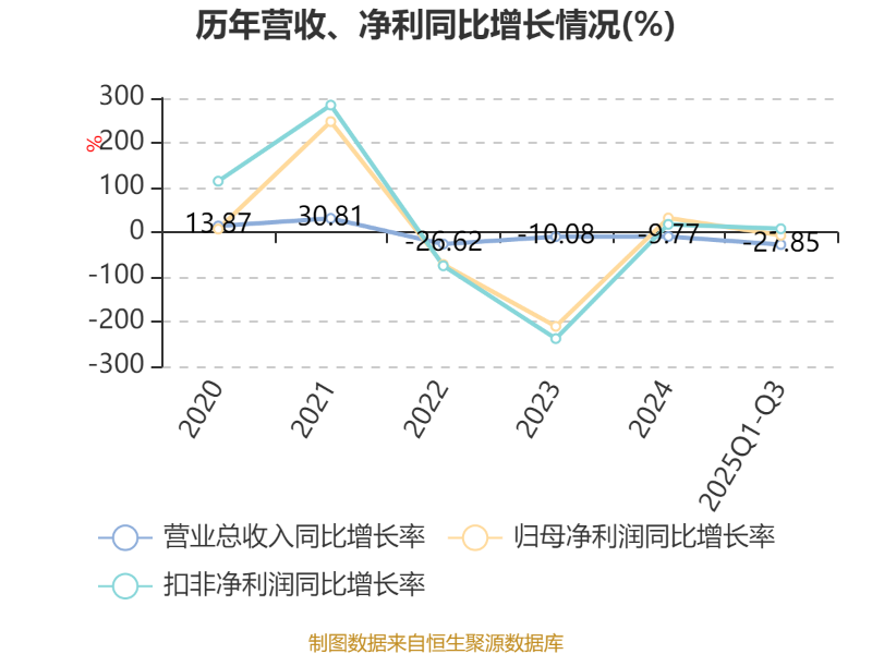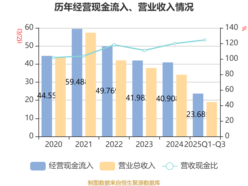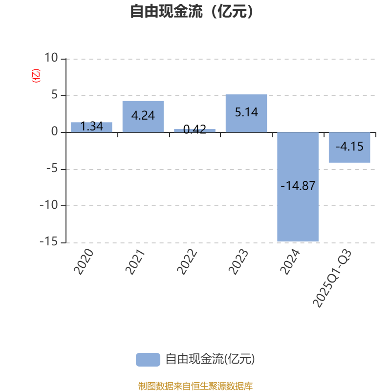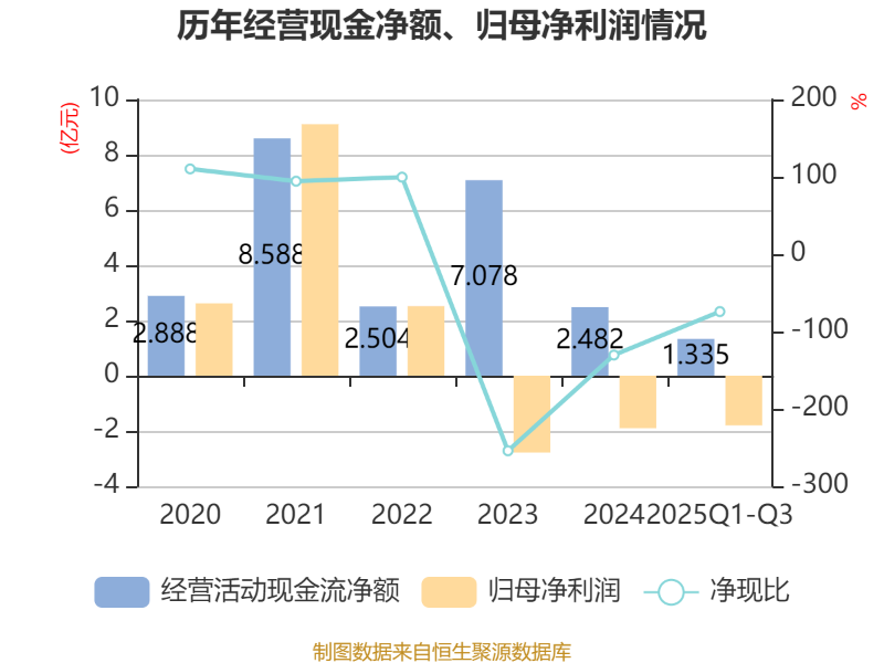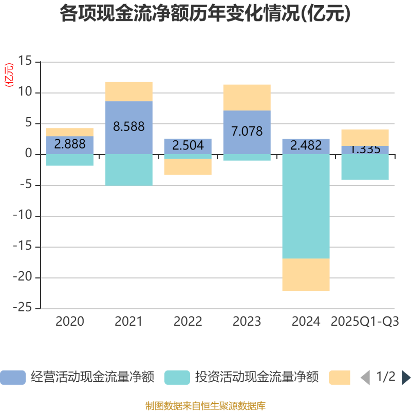 2025年前三季度,公司经营活动现金流净额为1.34亿元,同比下降55.83%;筹资活动现金流净额2.66亿元,同比增加4.44亿元;投资活动现金流净额-4.15亿元,上年同期为-9.91亿元。
