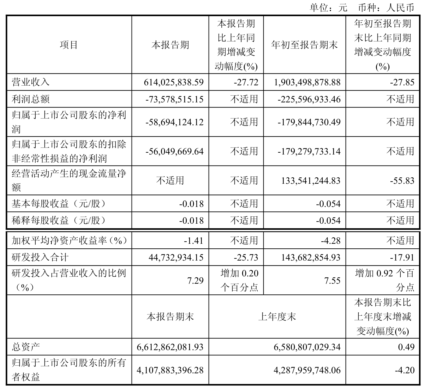中证智能财讯龙腾光电(688055)10月30日披露2025年第三季度报告。前三季度公司实现营业总收入19.03亿元,同比下降27.85%;归母净利润亏损1.8亿元,上年同期亏损1.68亿元;扣非净利润亏损1.79亿元,上年同期亏损1.94亿元;经营活动产生的现金流量净额为1.34亿元,同比下降55.83%;报告期内,龙腾光电基本每股收益为-0.054元,加权平均净资产收益率为-4.28%。