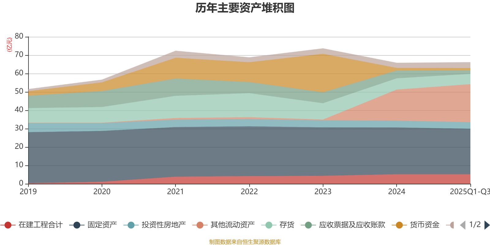 资产重大变化方面,截至2025年三季度末,公司其他流动资产较上年末增加22.35%,占公司总资产比重上升5.59个百分点;应收票据及应收账款较上年末减少54.99%,占公司总资产比重下降3.56个百分点;固定资产较上年末减少2.84%,占公司总资产比重下降1.28个百分点;存货较上年末减少8.48%,占公司总资产比重下降0.83个百分点。