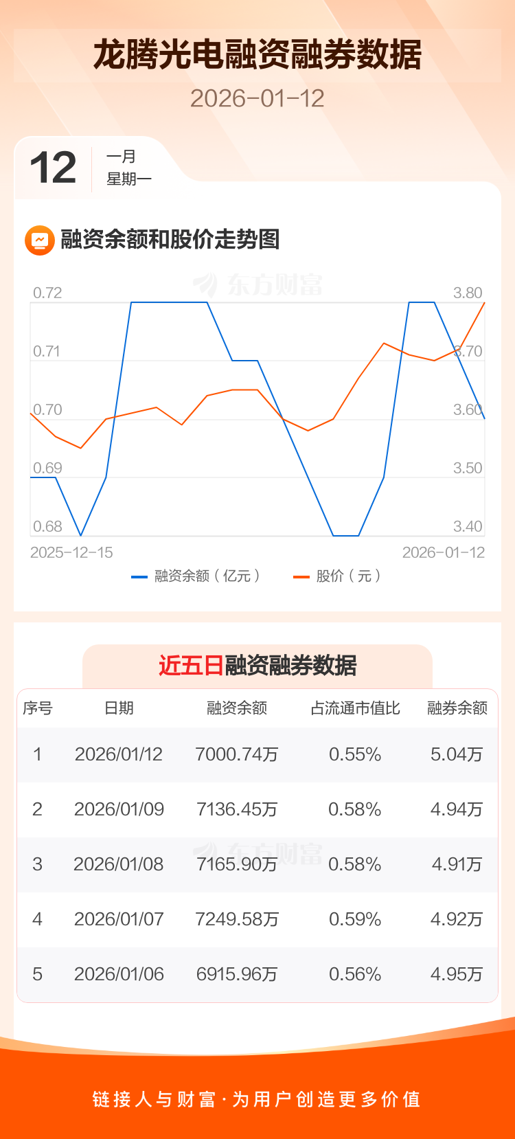 交易所最新数据显示,龙腾光电于2026年1月12日获融资买入192.36万元,融资偿还328.07万元,当日融资净偿还135.71万元。目前,该股融资余额7000.74万,占流通市值比例为0.55%。