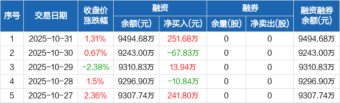 莱伯泰科:融资净买入251.68万元,融资余额9494.68万元(10-31)
