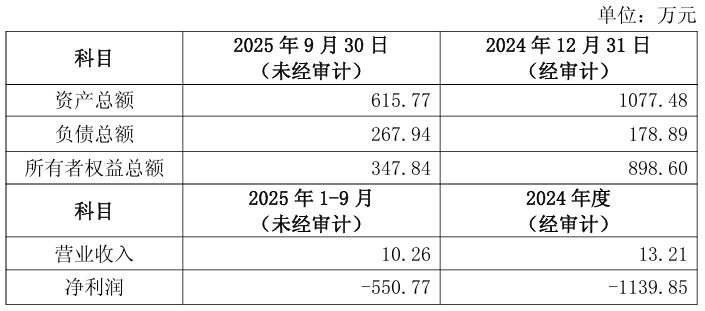 但在业绩方面,目前该公司处于净利润亏损状态。2024年,中科鸿泰实现营业收入13.21万元,净利润亏损1139.85万元。2025年1-9月,中科鸿泰实现营业收入10.26万元,净利润亏损550.77万元。