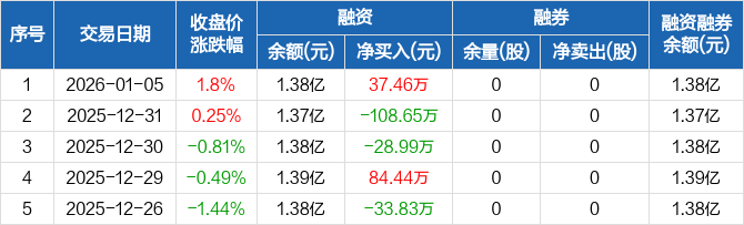 金达莱:融资净买入37.46万元,融资余额1.38亿元(01-05)
