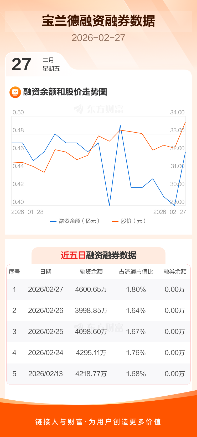 交易所最新数据显示,宝兰德于2026年2月27日获融资买入1136.62万元,融资偿还534.82万元,当日融资净买入601.8万元。目前,该股融资余额4600.65万,占流通市值比例为1.80%。