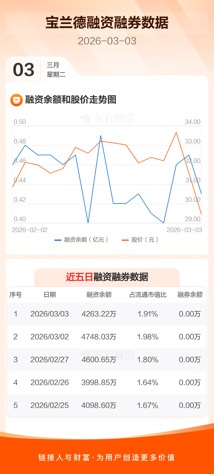 交易所最新数据显示,宝兰德于2026年3月3日获融资买入446.25万元,融资偿还931.05万元,当日融资净偿还484.81万元。目前,该股融资余额4263.22万,占流通市值比例为1.91%。