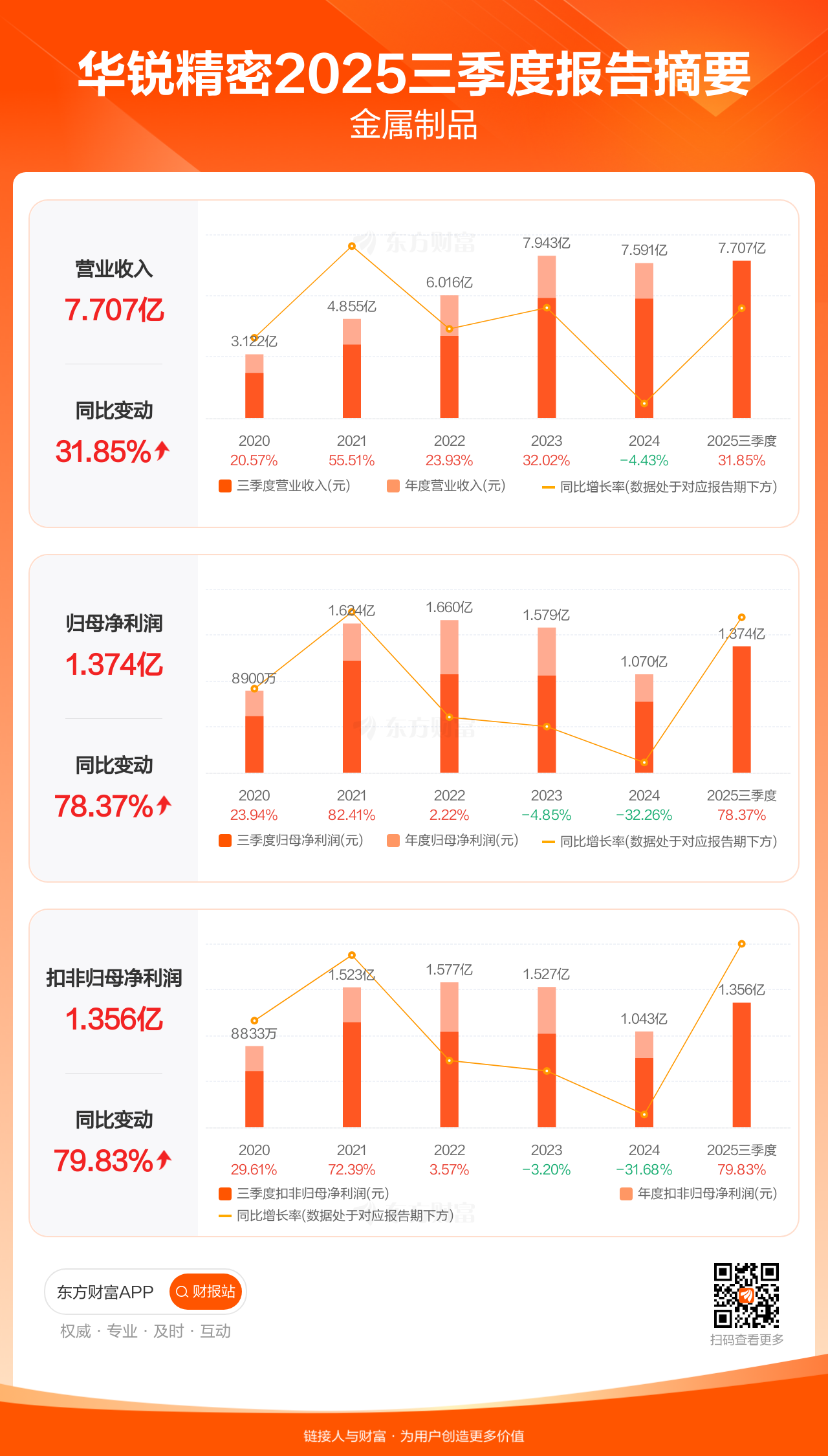 华锐精密10月31日发布2025年三季报显示,公司前三季实现营业收入7.71亿元,同比增长31.85%;归母净利润1.37亿元,同比增长78.37%;扣非归母净利润1.36亿元,同比增长79.83%。