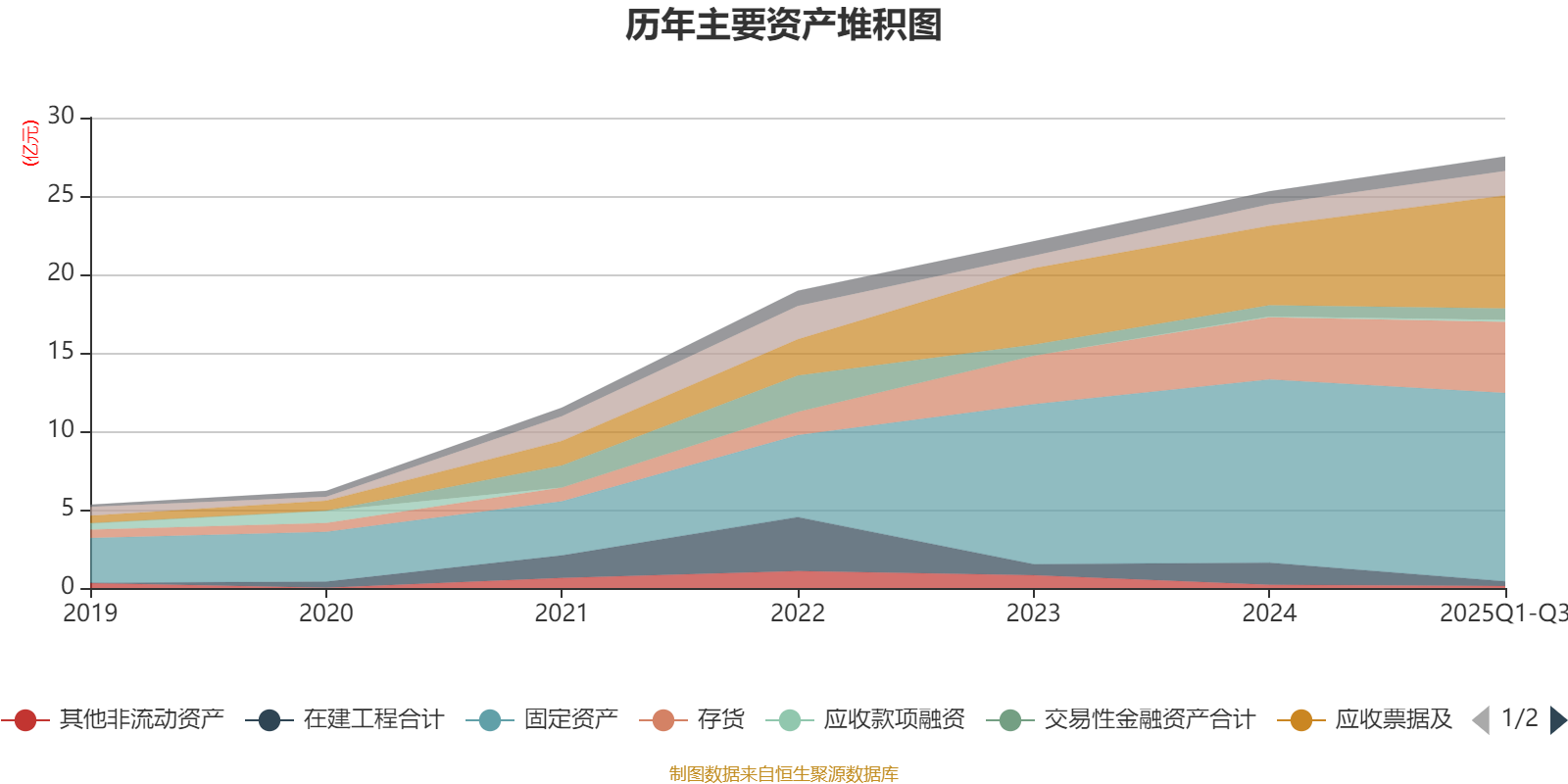 资产重大变化方面,截至2025年三季度末,公司应收票据及应收账款较上年末增加42.27%,占公司总资产比重上升6.16个百分点;在建工程合计较上年末减少78.78%,占公司总资产比重下降4.49个百分点;固定资产较上年末增加2.71%,占公司总资产比重下降2.6个百分点;存货较上年末增加14.1%,占公司总资产比重上升0.76个百分点。