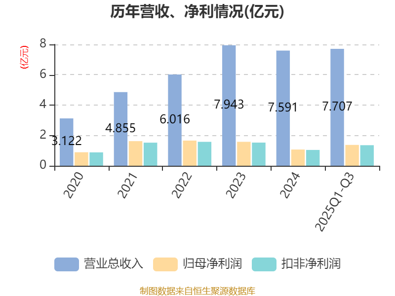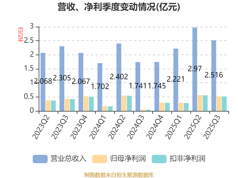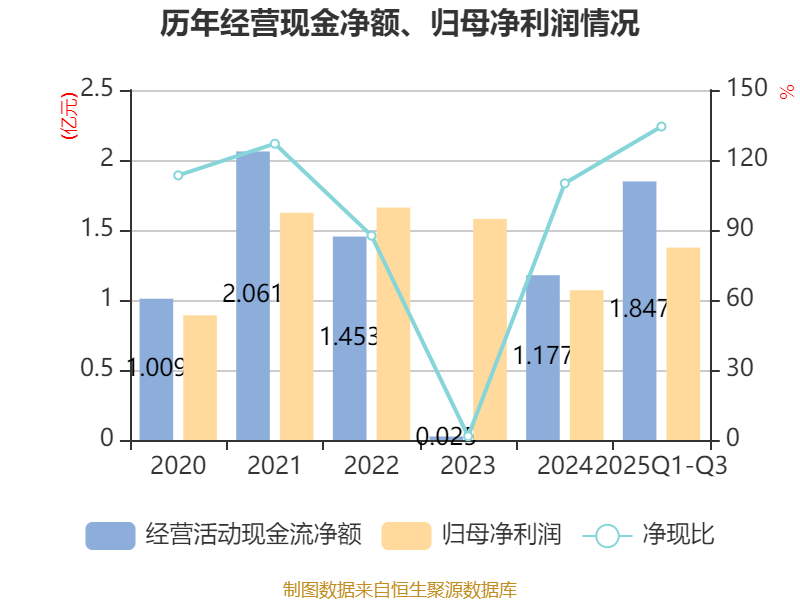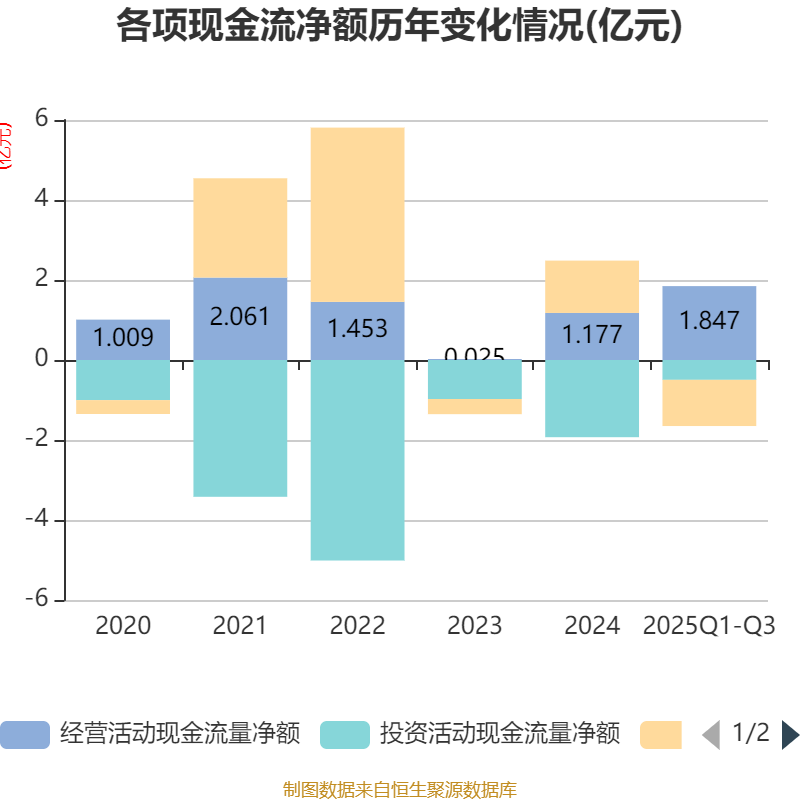2025年前三季度,公司经营活动现金流净额为1.85亿元,同比增长3768.7%;筹资活动现金流净额-1.16亿元,同比减少2.65亿元;投资活动现金流净额-4964.92万元,上年同期为-1.86亿元。