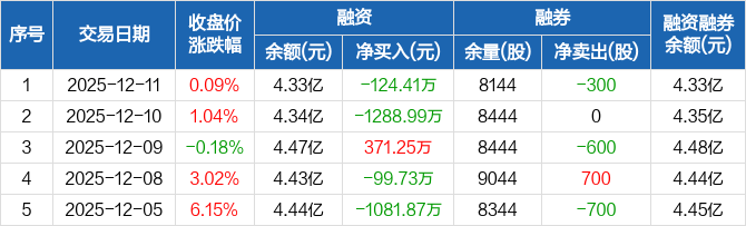 华锐精密:融资净偿还124.41万元,融资余额4.33亿元(12-11)