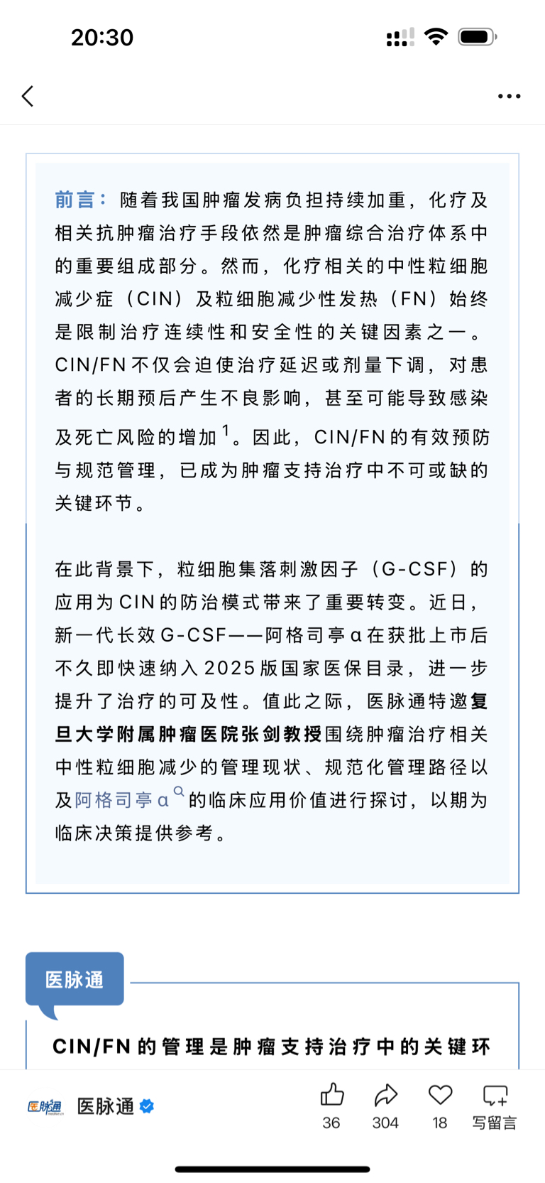 张剑教授:第四代长效G-CSF阿格司亭纳入医保,助力肿瘤治疗相关中性粒细胞减少症