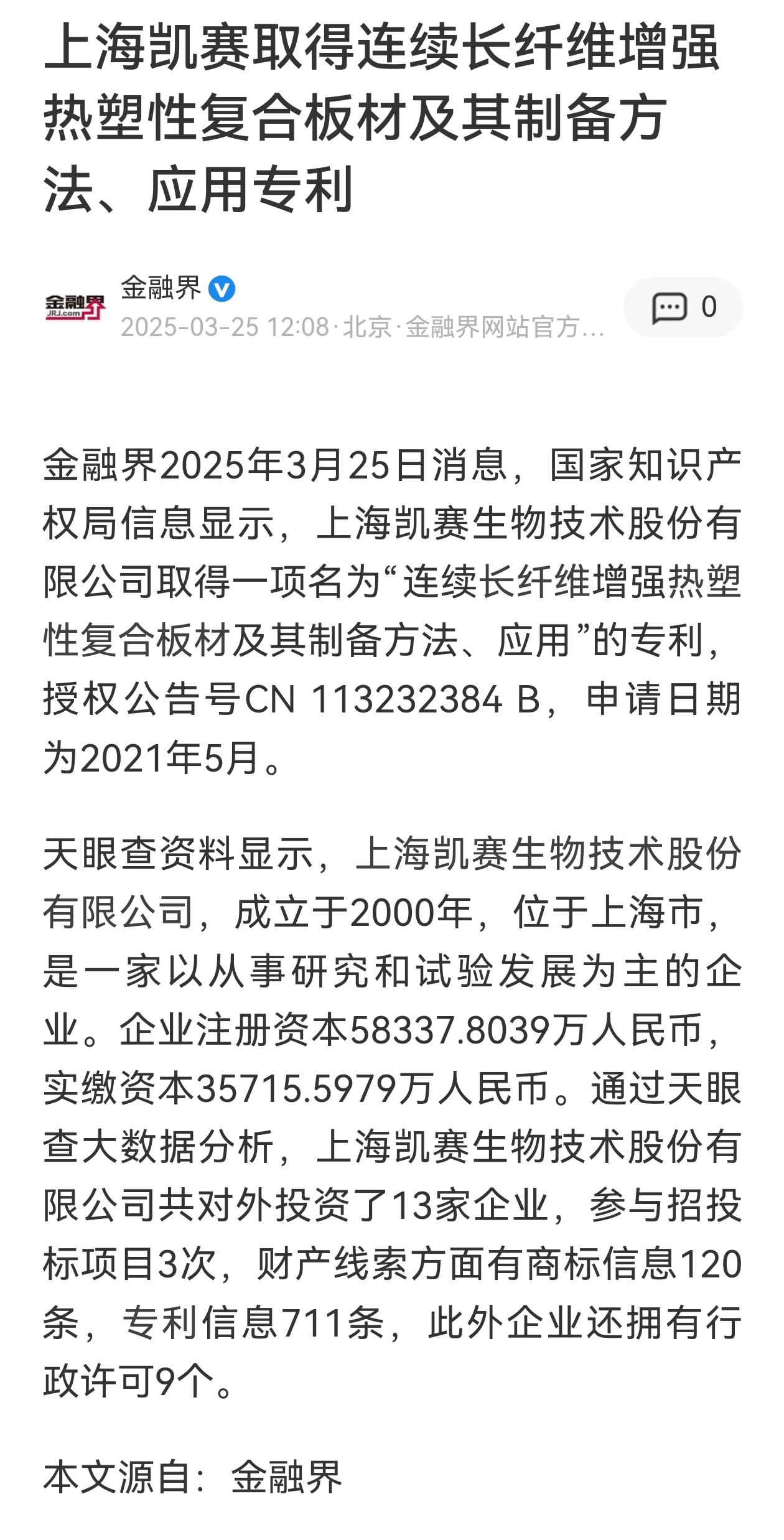 $凯赛生物(SH688065)$ 上海凯赛取得连续长纤维增强热塑性复合板材及其制备方法、应用专利。