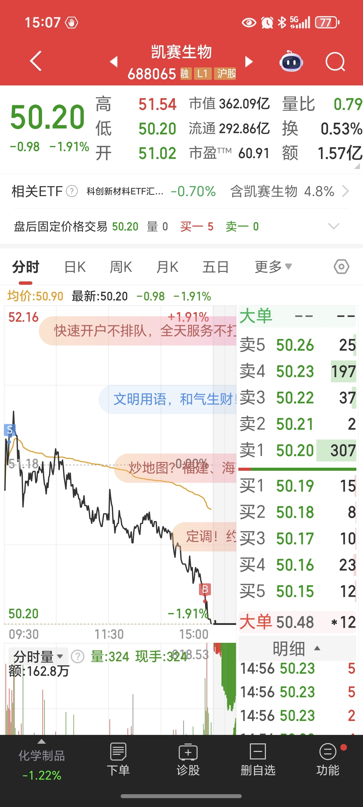 $凯赛生物(SH688065)$ 看看早上冲高不对劲,跑了1/3仓,尾盘一路向下,想了下再加回来