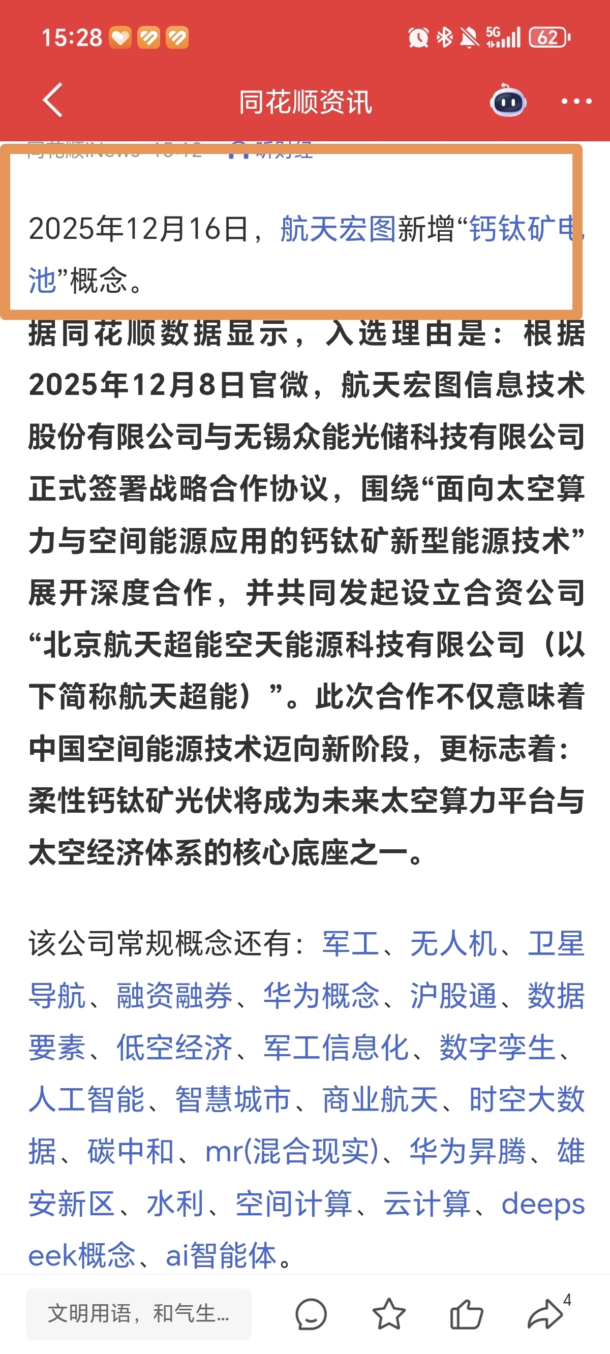 航天宏图+众能光储→航天超能,同花顺平台航天宏图新增“钙钛矿电池”概念。
