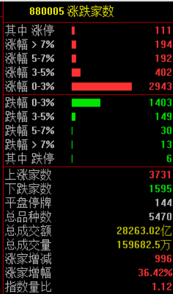 市场共3731只个股上涨,111只个股涨停,1595只个股下跌。