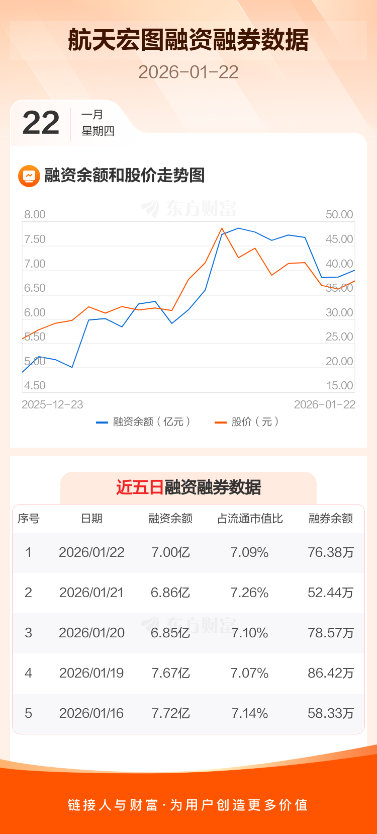 交易所最新数据显示,航天宏图于2026年1月22日获融资买入9752.72万元,融资偿还8149.30万元,当日融资净买入1603.42万元。目前,该股融资余额7.00亿,占流通市值比例为7.09%。