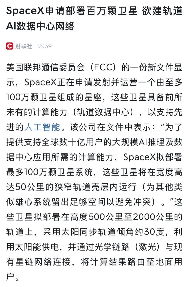 马斯克星链申请卫星突破100万颗,是我们20万颗的五倍,航天竞争越演越烈。