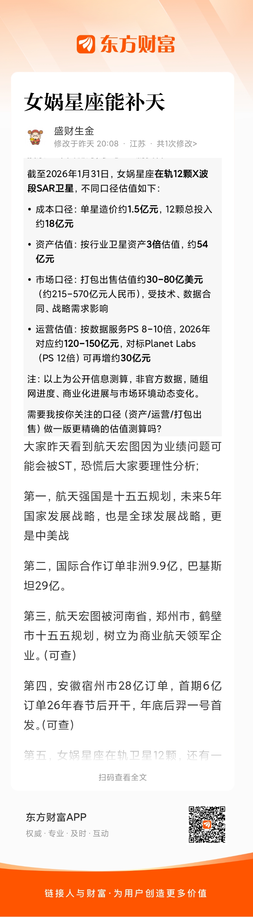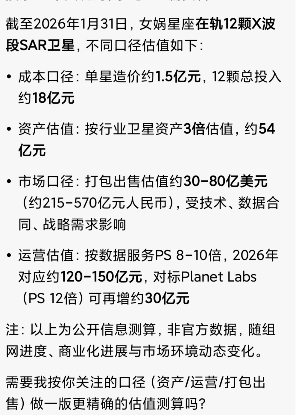 第五,女娲星座在轨卫星12颗,还有一颗国家地理主管部门,共13颗,是中国唯一一家在轨遥感卫星公司,光13颗市场估计在150亿。