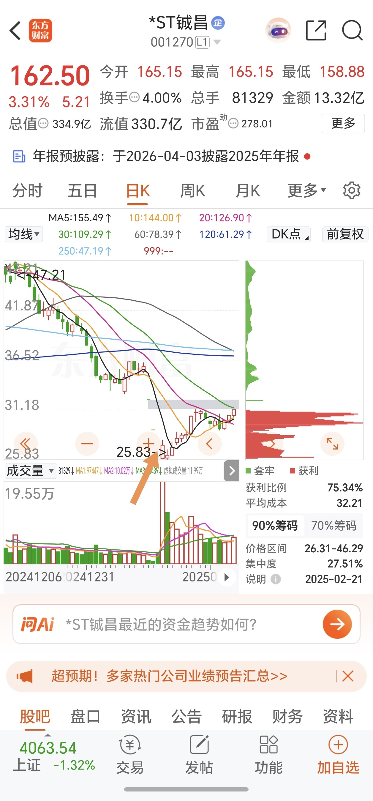 箭头所指就是年报预披露,退市警示。年报正常st股价反而一路大涨!仅供参考~