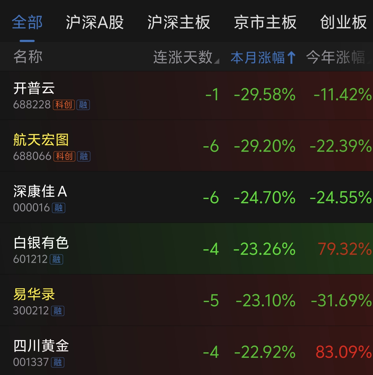 连跌6天,月跌幅29.2%,排名第二,仅次于开普云